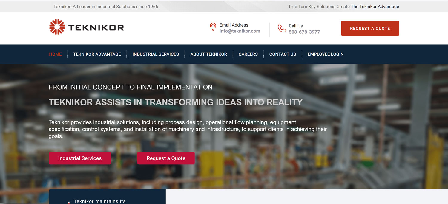 Quadro Marketing designed and developed a new website for Teknikor in 2025. Located in Fall River, MA, Teknikor is a trusted and high-quality industrial solutions provider with over 50+ years of experience.